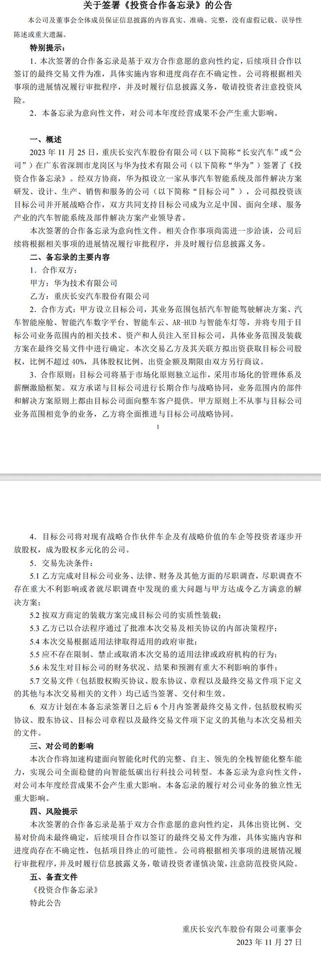 11月26日,长安汽车发布公告称,公司与华为技术有限公司(简称:华为)于11月25日在广东省深圳市龙岗区签署了《投资合作备忘录》。