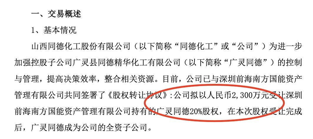 时间回溯到11月18日,同德化工发布公告称,为进一步加强控股子公司广灵同德的控制与管理,提高决策效率、整合相关资源,同德化工已与深圳前海南方国能资产管理有限公司共同签署了《股权转让协议》。