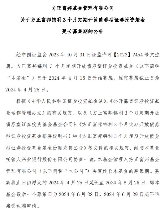 今日,方正富邦基金管理有限公司发布关于方正富邦锦利3个月定期开放债券型证券投资基金延长募集期的公告。公告称,方正富邦锦利3个月定期开放债券型证券投资基金已于2024年4月15日开始募集,现决定延长该基金的募集期。募集截止日由原定的2024年4月25日延长至2024年6月28日。