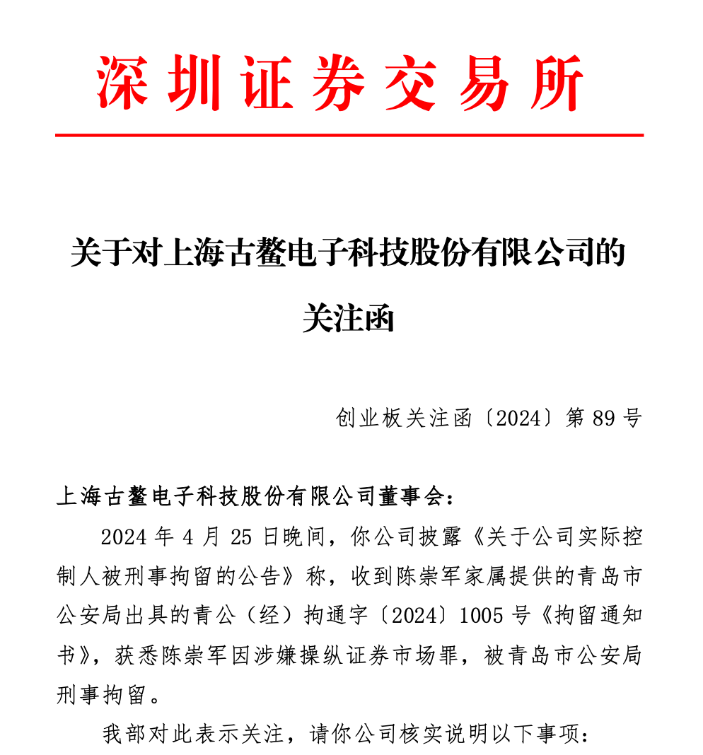 在关注函中,深交所要求古鳌科技充分评估并说明,陈崇军被刑事拘留事项对公司控制权稳定性、日常生产经营、投融资、债务偿还、定期报告披露等方面已产生及可能产生的影响,公司已采取或拟采取的应对措施,并及时、充分提示相关风险。