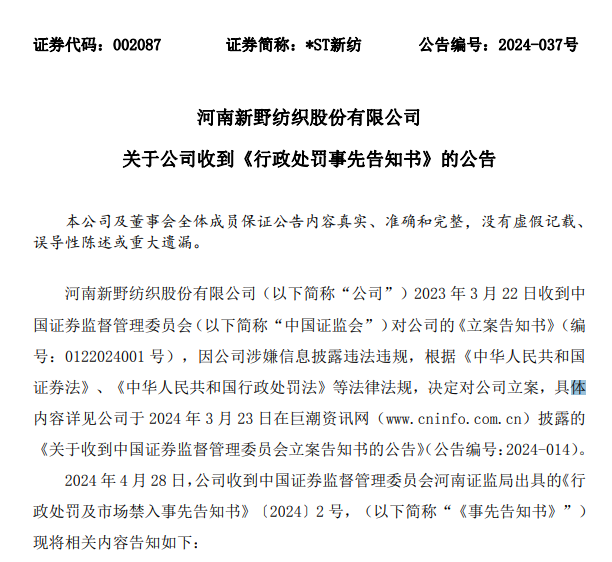 4月28日晚间,*ST新纺(002087)公告称,公司收到河南证监局出具的《行政处罚及市场禁入事先告知书》,因连续7年财务造假,存在虚增营业收入,虚减、虚增营业成本,虚增存货,虚增研发费用,虚增、虚减利润等违法事实,该公司及相关责任人拟被给予处罚。