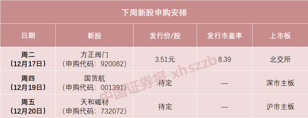 日程安排上,下周二(12月17日)可申购方正阀门,下周四(12月19日)可申购国货航(001391),下周五(12月20日)可申购天和磁材(603072)。