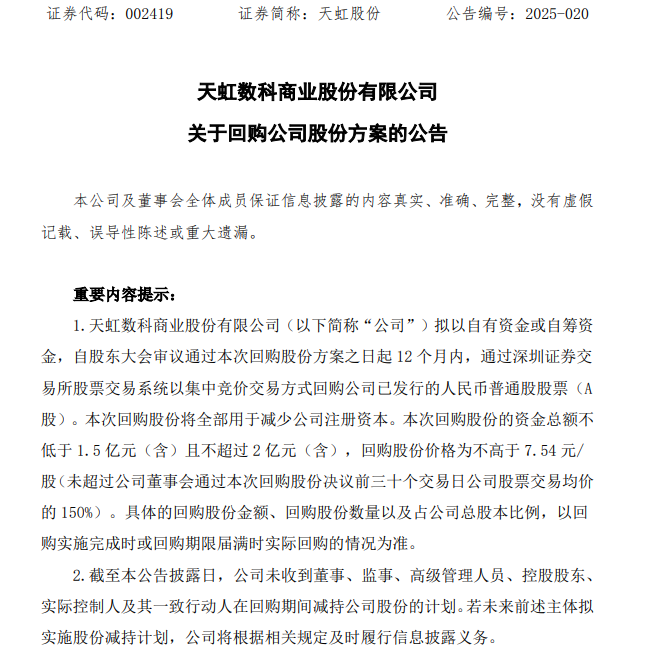 天虹股份公告,公司拟以自有资金或自筹资金通过集中竞价交易方式回购公司已发行的人民币普通股股票(A股),将全部用于减少公司注册资本。本次回购股份的资金总额不低于1.5亿元且不超过2亿元,回购股份价格为不高于7.54元/股。