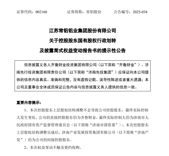 5月13日,常铝股份(002160)公告称,公司控股股东齐鲁财金的上层股权结构发生调整,济南市国资委将其持有的齐鲁财金32%股权划转至济南先投集团。此次调整不会导致公司控股股东、最终实际控制人发生变化,直接控股股东仍为齐鲁财金,最终实际控制人仍为济南市国资委。调整后,济南产发仍为公司间接控股股东。此次权益变动不触及要约收购,也不会对公司主要业务和经营活动产生重大影响。