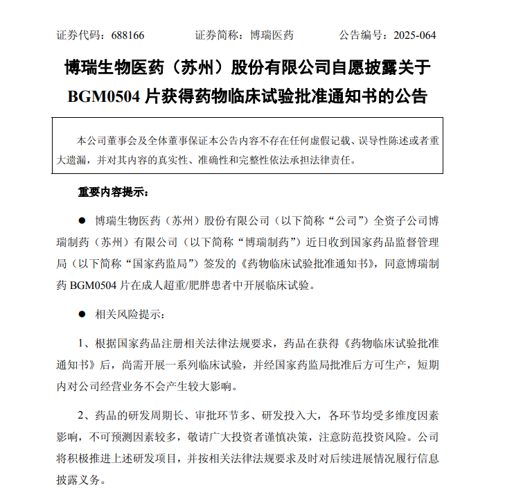 9月15日,博瑞医药公告称,公司全资子公司博瑞制药近日收到国家药品监督管理局签发的《药物临床试验批准通知书》,同意BGM0504片在成人超重/肥胖患者中开展临床试验。