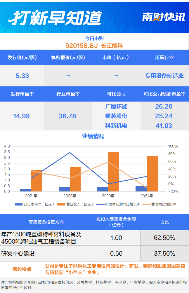 9月24日,有一只新股申购,为北交所的长江能科(920158.BJ)。该公司是一家专注于能源化工专用设备的设计、研发、制造和服务的国家级专精特新“小巨人”企业,主要产品包括电脱设备、分离设备、换热设备、存储设备、固碳设备、氢能设备等能源化工专用设备以及助剂和技术服务,广泛应用于油气工程、炼油化工、海洋工程、清洁能源等领域。