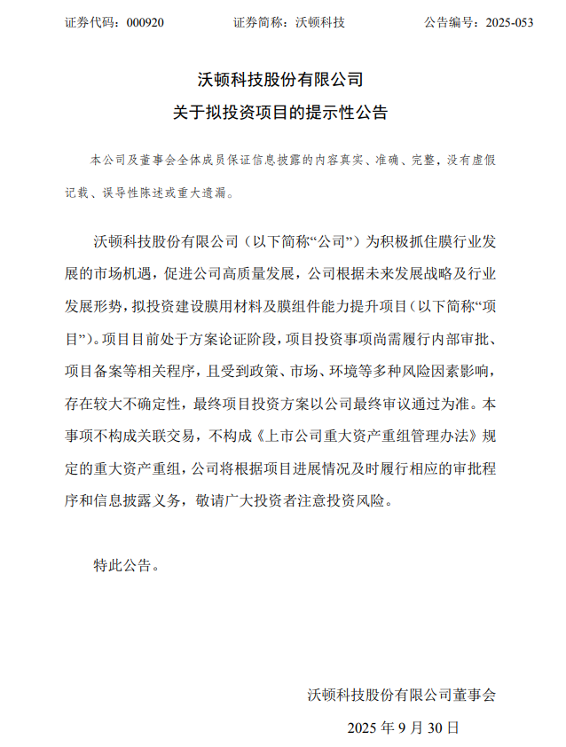 9月29日,沃顿科技公告称,公司为抓住膜行业发展机遇,促进高质量发展,拟投资建设膜用材料及膜组件能力提升项目。目前项目处于方案论证阶段,投资事项需履行内部审批、项目备案等程序,并受多种风险因素影响,存在较大不确定性。该事项不构成关联交易或重大资产重组,公司将根据进展及时履行审批程序和信息披露义务。
