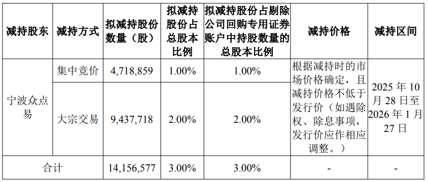 上述股东计划在本减持计划公告披露之日起15个交易日后的三个月内(窗口期除外)通过集中竞价或者大宗交易方式减持公司股份合计不超过3,207,699股(不超过公司总股本的3.00%),其中通过集中竞价交易方式减持公司股份不超过1,069,233股,即不超过公司总股本的1.00%;通过大宗交易方式减持公司股份不超过2,138,466股,即不超过公司总股本的2.00%。
