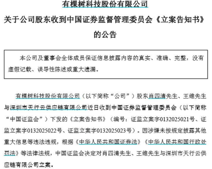 有棵树表示,股东肖四清、王维与深圳市天行云供应链有限公司将配合证监会立案调查工作,并按照相关法律法规的规定和监管要求及时履行信息披露义务。
