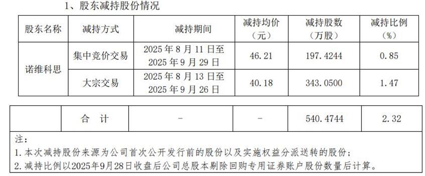 2025年8月11日至2025年9月29日,诺维科思通过集中竞价交易减持197.4244万股,减持均价46.21元;2025年8月13日至2025年9月26日,诺维科思通过大宗交易减持343.0500万股,减持均价40.18元。诺维科思合计减持540.4744万股。经计算,2025年8月11日至2025年9月29日,诺维科思减持套现金额合计为2.29亿元。