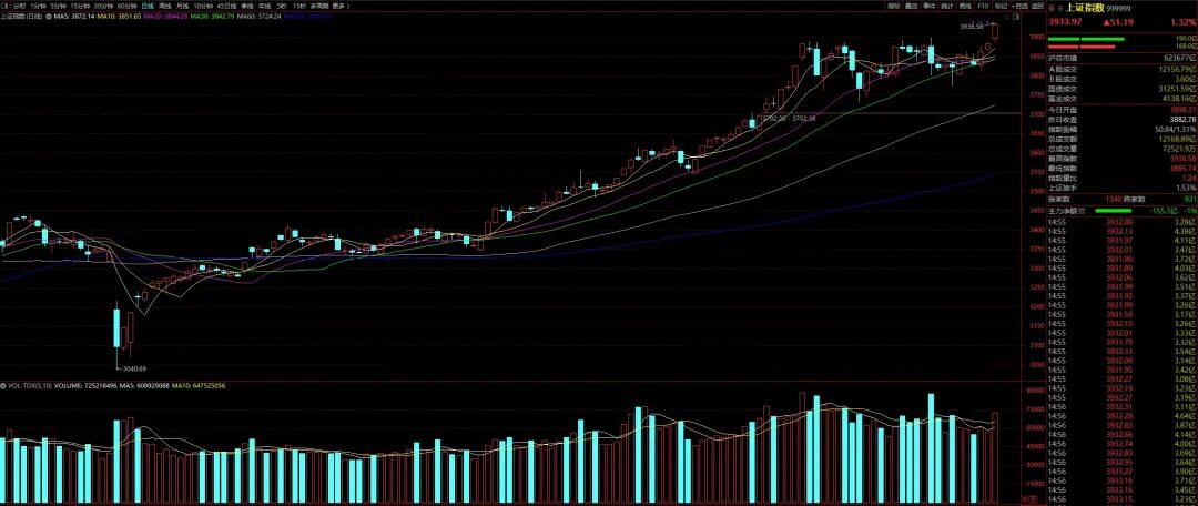 截至收盘,上证指数报收3933.97点,上涨1.32%;深证成指报收13725.56点,上涨1.47%;创业板指报收3261.82点,上涨0.73%。两市合计成交量突破2.5万亿元大关,达到2.65万亿元。