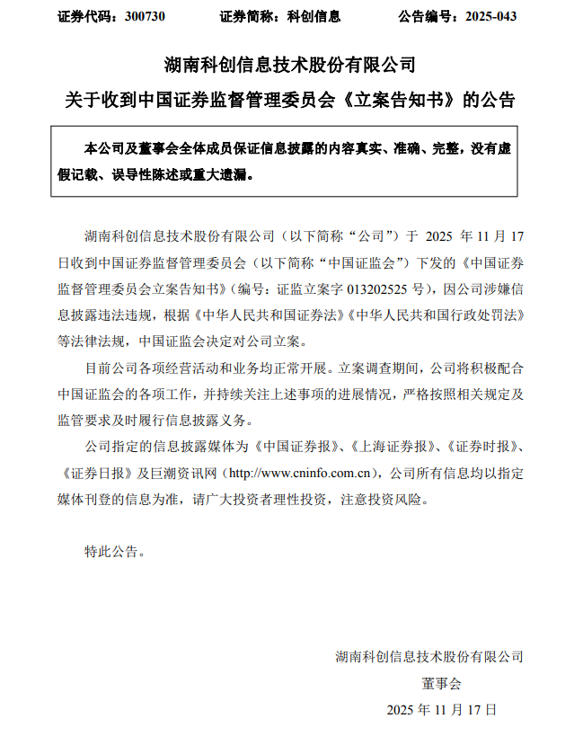 11月17日,实朴检测(301228)晚间公告,公司股票连续三个交易日(2025年11月13日、11月14日、11月17日)内收盘价格涨幅偏离值累计超过30%,根据《深圳证券交易所交易规则》的有关规定,属于股票交易异常波动情形。经核查,公司、控股股东及实际控制人不存在应披露而未披露的重大事项或处于筹划阶段的重大事项。在公司股票交易异常波动期间,公司控股股东、实际控制人未有买卖公司股票的情形。