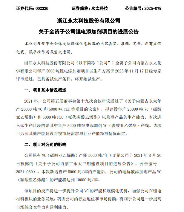 11月17日电,永太科技(002326)11月17日公告,全资子公司内蒙古永太化学有限公司年产5000吨锂电添加剂项目试生产方案于2025年11月17日经专家评审通过,已具备试生产条件,将开始试生产。