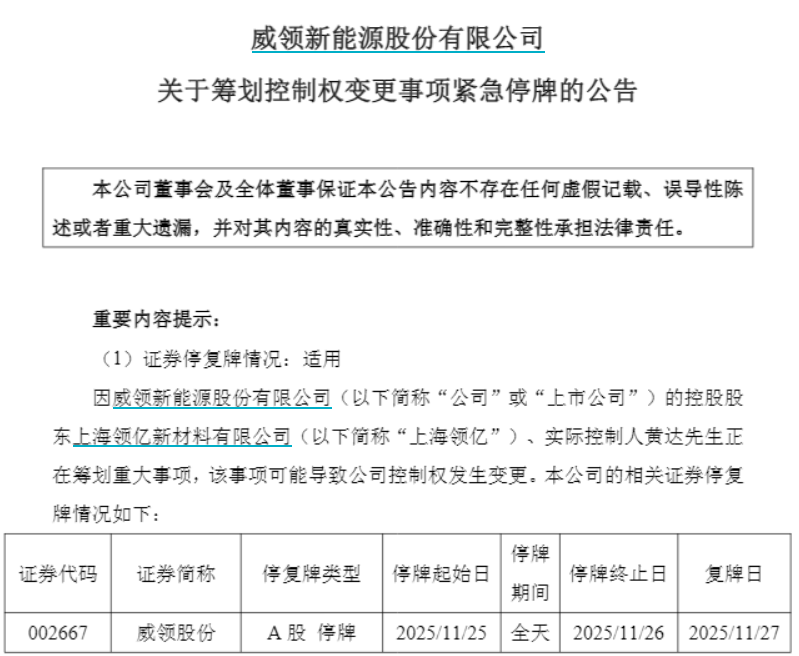 11月24日涨停收盘的威领股份,当日晚间披露了紧急停牌公告,公司控股股东上海领亿新材料有限公司(以下简称“上海领亿”)、实际控制人黄达正在筹划重大事项,该事项可能导致公司控制权发生变更,公司股票11月25日起停牌。