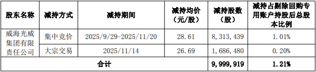 2025年9月29日至2025年11月20日,光威集团减持数量合计9,999,919股。经计算,光威集团减持金额为2.83亿元。