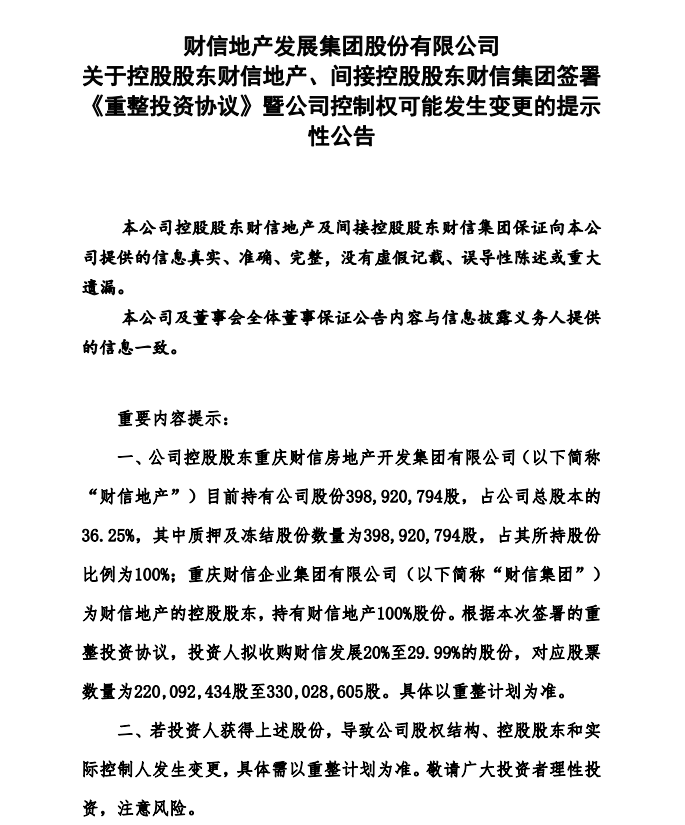 12月2日晚,财信发展发布公告称,公司控股股东财信地产及间接控股股东财信集团已与江西中久天然气集团有限公司(下称“江西中久”)签署《重整投资协议》,后者拟收购财信发展20%至29.99%的股份。若此次收购完成,财信发展的股权结构、控股股东及实际控制人将发生变更,江西中久实际控制人雍芝君将成为上市公司新的实际控制人。