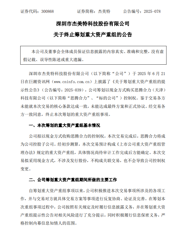 12月2日,杰美特公告称,公司于2025年6月21日披露了拟以现金方式收购思腾合力(天津)科技有限公司控制权的事宜。但公司与交易各方未能就本次交易的核心条款达成一致,决定终止筹划以现金方式购买思腾合力(天津)科技有限公司控制权的重大资产重组事项。