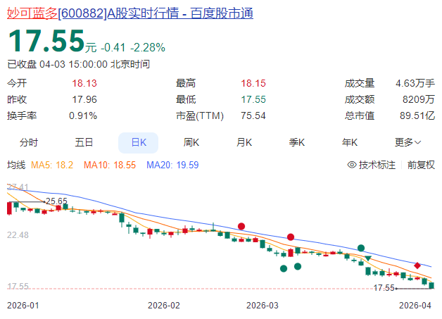今年以来,妙可蓝多(600882)股价跌跌不休,至4月3日收盘,年内跌幅超过30%,让投资者大为不满。