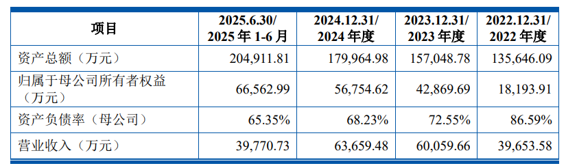 财务方面,于2022年、2023年、2024年及2025年1-6月,公司实现营业收入分别约为3.97亿元、6.01亿元、6.37亿元、3.98亿人民币;同期净利润分别约为9772.15万元、2.34亿元、1.53亿元、9370.62万人民币。