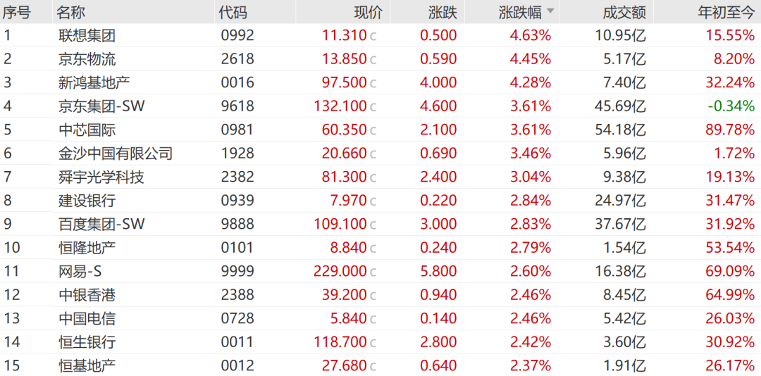 恒生指数成份股中65只上涨,21只下跌。联想集团(HK0992)涨4.63%,京东物流(HK2618)涨4.45%,新鸿基地产(HK0016)涨4.28%,领涨蓝筹。