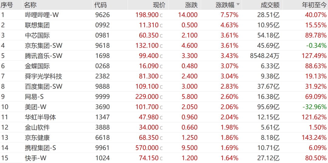 恒生科技指数成份股中,20只上涨,9只下跌。哔哩哔哩(HK9626)涨7.57%,联想集团(HK0992)涨4.63%,中芯国际(HK0981)涨3.61%,领涨恒生科技指数成份股。