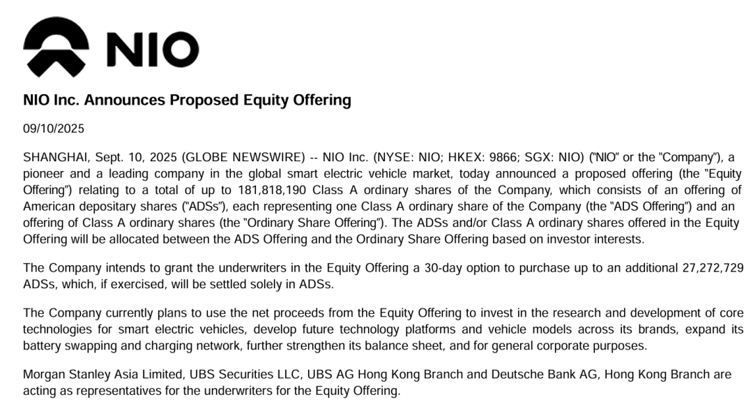 9月10日,蔚来(NIO)宣布,拟进行一项涉及合共最多1.82亿股公司A类普通股的发行(股权发行),该发行包括美国存托股份(ADS)的发售(每份代表公司一股A类普通股,ADS发行)和A类普通股的发售(普通股发行)。股权发行中发行的ADS和/或A类普通股将根据投资者兴趣在ADS发行和普通股发行之间进行分配。