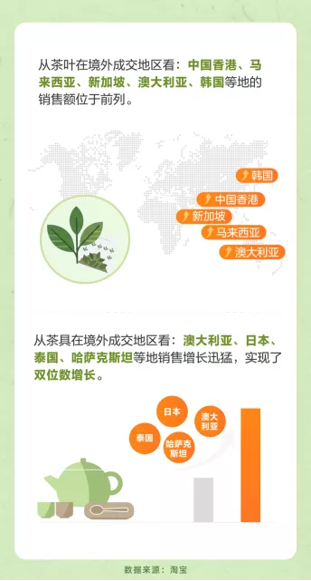 茶周边产品也同样畅销海外。茶具成交中,澳大利亚、日本、泰国、哈萨克斯坦等地销售增长迅猛,实现了双位数增长。在以华人为核心购买群体的影响下,越来越多的外国消费(883434)者也通过茶消费(883434),来体验中国文化。